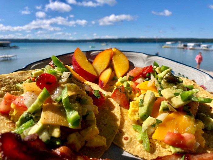 Breakfast with Jody is on the road in beautiful Glen Arbor, Michigan. The view from our kitchen overlooking the majestic waters of Glen Lake was inspiration for today’s summer breakfast tacos.